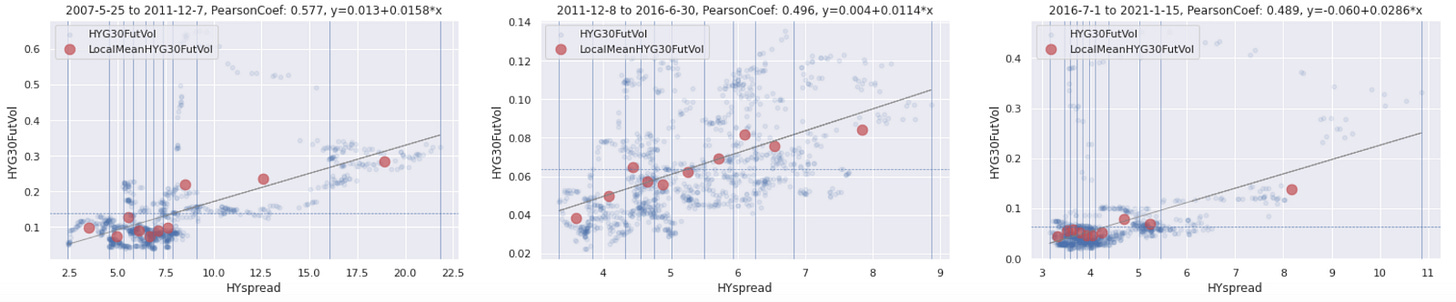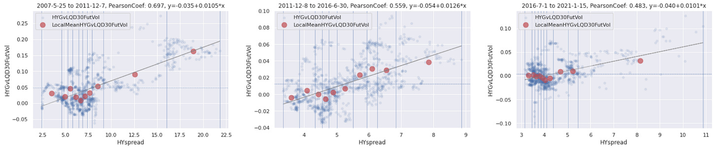The spread also relates to the difference between the future 30-day volatility of HYG and LQD, the iShares Investment Grade Corporate Bond ETF. Higher values of the spread are associated with higher values in (future 30-day HYG volatility — future 30-day LQD volatility). This relationship has been weakening somewhat over time. From 2016 to present, its Pearson coefficient was 0.483.