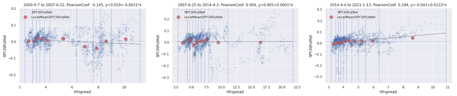 When we compare the spread to (future 30-day HYG returns — previous 30-day HYG returns), we see a similar relationship.