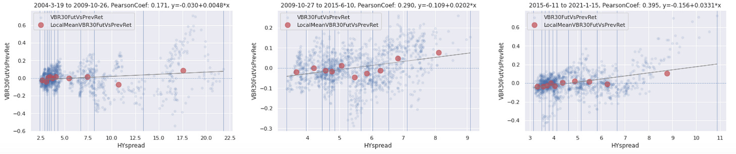 In contrast, the HY spread’s relationship with (VBR’s future 30-day returns — VBR’s previous 30-day returns) has been strengthening over time. From 2015 to present, that relationship had a Pearson coefficient of 0.395.