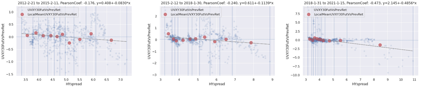 From 2012 to present, there’s a negative correlation between the HY spread and (future 30-day UVXY returns — previous 30-day UVXY returns). This relationship has been strengthening over time, and from 2018 to present it had a Pearson coefficient of -0.473. Higher HY spread values are associated with future UVXY returns being lower than previous UVXY returns.