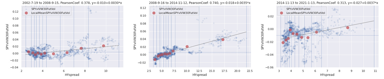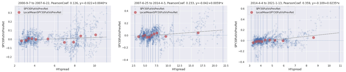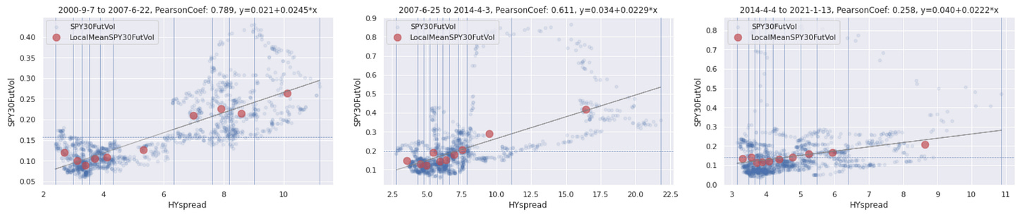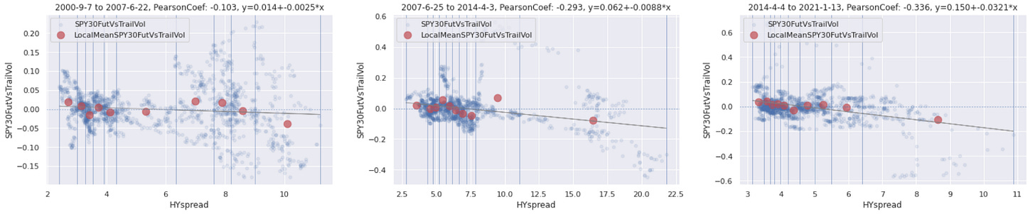 From 2000 to present, there’s a positive correlation between the HY spread and SPY’s volatility over the next 30 days; higher spread values are associated with higher levels of future volatility. Interestingly, this relationship has been weakening over time. Between 2000 and 2007 the Pearson coefficient was 0.789, but from 2014 to present it fell to 0.258.