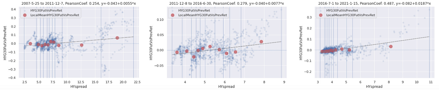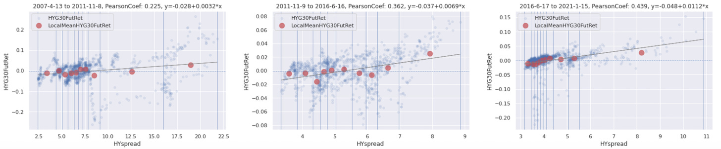 From 2007 to present, there’s a positive correlation between the HY spread and HYG’s return over the next 30 days. This relationship has been strengthening over time, and its Pearson coefficient currently stands at around 0.439.