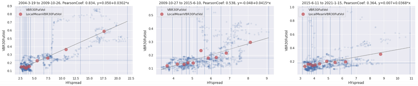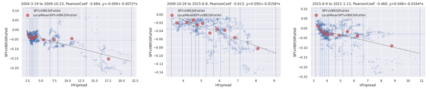 From 2004 to present, there’s a positive correlation between HY spread values and the future 30-day volatility of VBR, but the correlation has significantly weakened over time. From 2004 to 2009 its Pearson coefficient was 0.834, but from 2015 to present its coefficient was 0.364.